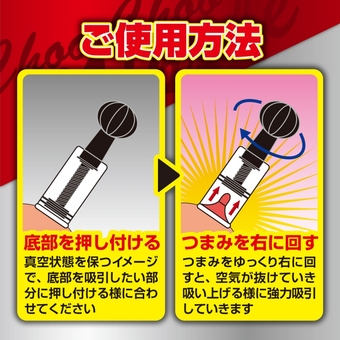 吸う快感&吸われる快感をアナタに。 つまみをくるくる回すだけという簡単な使用方法で、乳首をギュインギュインと吸っていきます。 真空状態を保つイメージで底部を吸引したい部分に押し当て、つまみをゆっくり右に回すことで強力吸引! 皮膚にしっかりと密着するように、ローションなどを使うとさらに快感度もアップ!!! 乳首だけでなく、アイデア次第でいろんな吸引調教を楽しんで♪ サイズ違い、AとBの2タイプ同時発売!! パッケージサイズ(mm):H200×W110×D44 本体サイズ(mm):内径:31mm/外径:44mm 原産国:中国 材質:ABS