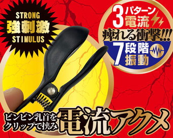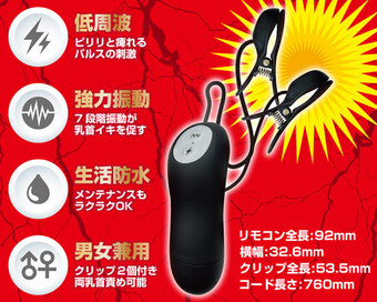 ビンビン乳首をビリビリクリップで挟み電流アクメ。3パターンの電流と7段階振動が乳首を痺れさせ、チクイキへ誘う!? イタ気持ちイイが癖になる、未だ見ぬ衝撃的な快感を愉しもう。 【付属品】 本体、単四電池×2本 ・3パターン低周波電流パルス ・7段階振動 ・生活防水 ・男女兼用 パッケージサイズ(mm):H155×W106×D54 本体サイズ(mm):リモコン全長:92mm/横幅:32.6mm クリップ全長:53.5mm 原産国:中国