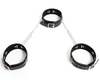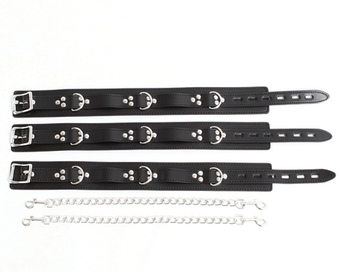 チェーンの長さを調節して使えるので便利。ノーマルなプレーに飽きた方、SMには興味があるけど踏み込めないという初心者の方にも安心、安全にお使いいただけます。 ※本製品はジョークグッズとなります。その他の目的でご使用になられた際の責任は一切負いかねますのでご了承ください。 【セット内容】 首輪×1本、太ももベルト×2本、拘束チェーン×2本 【サイズ】 首輪:長さ 約55.5cm/幅 約5cm/ベルト穴 5個 太ももベルト:長さ 約55.5cm/幅 約5cm/ベルト穴 5個 拘束チェーン:長さ 約41cm パッケージサイズ(mm):H480×W200×D25 原産国:中国 材質:合皮、金具