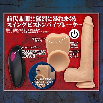 凶器が狂喜をもたらし狂気を生む! 想像を絶する狂喜の超強力回転! 更にピストン+振動で暴れまくる!! ●ストレスフリーの遠隔操作 ●7パターン先端強力振動 ●5パターン猛烈スイングピストン ●まるで人肌のような柔らかシリコンゲル素材 ●吸盤付きで床でも壁でもピタッと吸着! パッケージサイズ:23.0×11.0×7.5 cm 本体全長:22.8cm(吸盤含む) 挿入部最大径:3.7Φcm 定価:2,800円(税別)