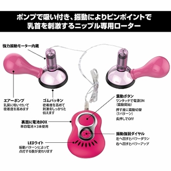 ポンプで吸い付き、振動によりピンポイントで乳首を刺激するニップル専用ローター。 ダイヤル式の振動強弱で好みの強さで乳首開発! ●7パターン振動機能 パッケージサイズ:16.5×20.0×5.2cm 吸引部径:4.9Φcm 定価:3,000円(税別)