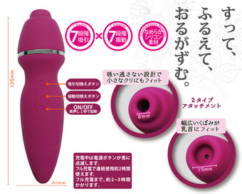 2タイプアタッチメントが付属し、乳首もクリも逃さずフィット。7段階吸引×7段階振動を搭載し、多彩なバリエーションを楽しめます。