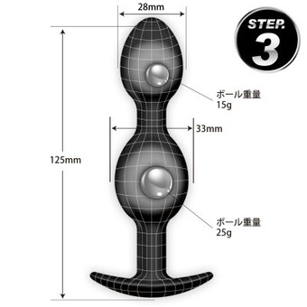 内側からコンッコンッと存在感をアピールする快感アナルプラグ。 アナル開発や日常的に装着して刺激を楽しめます♪ シリーズ最大のボディと、大小2つのボールで刺激たっぷりの「STEP.3」 メタルボール2個内蔵「小:15g 大:25g」 ●高品質シリコン製 パッケージサイズ:14.0×8.0×4.0cm 本体:全長12.5cm 挿入部最大径3.3Φcm 総重量:115g